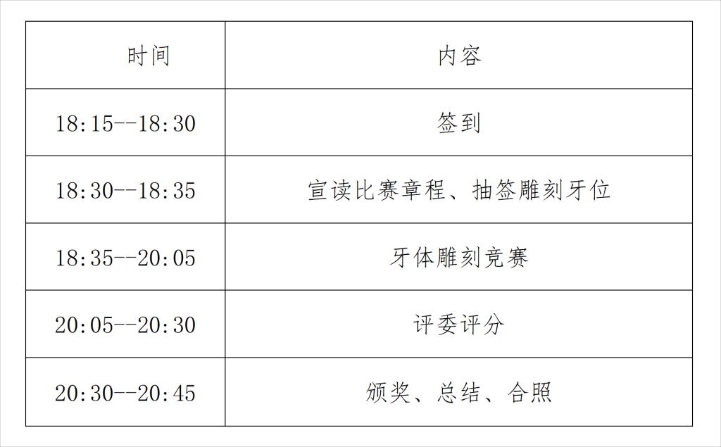 ③竞赛内容:1:1石膏牙牙体雕刻(11/21/14/24/16/26/36/46,现场随机抽1个牙位),最大限度地复刻标准牙的形态。限时90分钟。