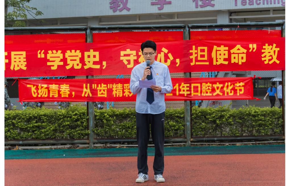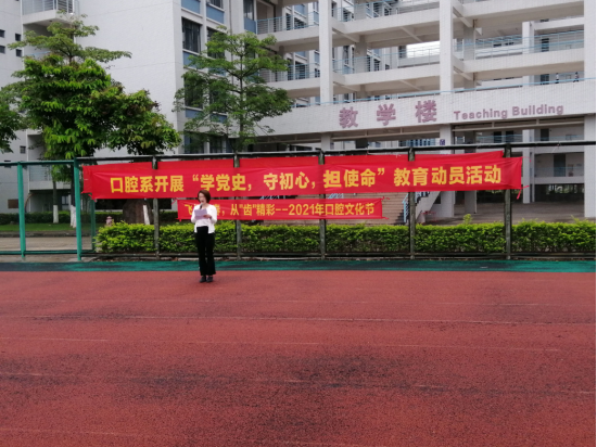 2021年4月26日上午,口腔系全体学生冒着细雨,参加升国旗仪式,开展了“学党史,守初心,担使命”主题教育动员活动。出席升旗仪式的老师有口腔系党支部副书记王华山,系团总支书记欧晓燕,20级辅导员冯伟健、冯倩。