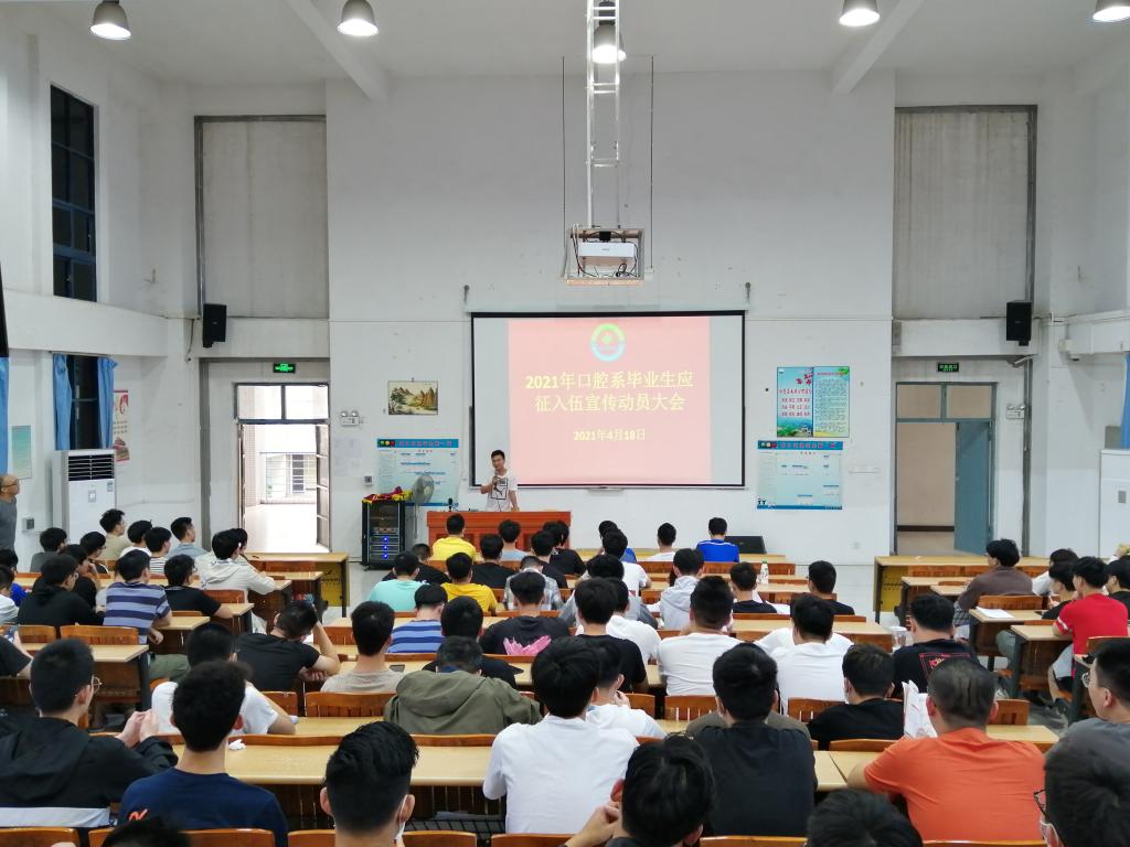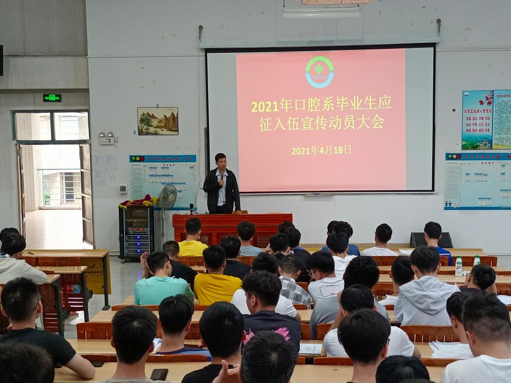 4月18日,口腔系在鼎湖校区组织开展一次了以“参军光荣,不负韶华”主题的应征入伍宣传动员大会,动员大会由口腔系毕业班辅导员刘炜新老师主持,口腔系党支部副书记王华山、以及2021届全体毕业班的男生参加了本次动员大会。