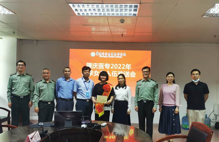 314日欢送会后,我校于318日上午,再次在端州校区举行入伍欢送会,这次欢送的是“巾帼不让须眉”的女生——21级口腔1班邓晴怡同学。学校党委委员、副校长李务迅,及学校党委办、学生处、武装部、必赢bwin线路检测中心党支部有关负责同志出席本次欢送会。