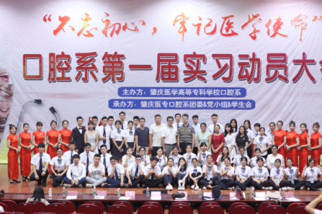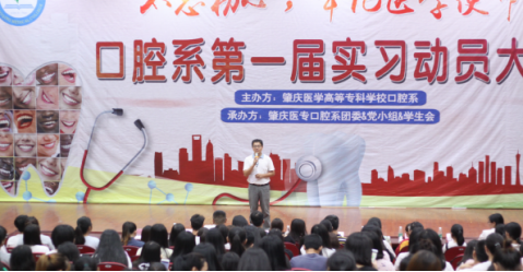 2018611日晚上7:30,由口腔系主办,口腔系团委、党小组、学生会承办的不忘初心,牢记医学使命口腔系第一届实习动员大会于学术厅拉开了序幕。此次大会出席的嘉宾有肇庆医专口腔系党支部颜仕尧副书记、口腔系教研室黎祺副主任、口腔系16级辅导员魏然老师、口腔系17级辅导员冯伟健老师、口腔系张海英老师、口腔系宋佳老师、以及1617级的口腔系学生。