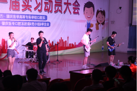 在主持人精彩的开场白和震撼人心的武术协会的表演后,口腔系16级辅导员魏然老师上台发言,希望同学们奋发进取,做学业有成的医学生,牢记母校校训大医精诚,知行合一。随后播放了15届实习生分享实习经验和在校师生对即将实习的学生的祝福视频。紧接着,党支部颜仕尧副书记上台演讲,陈述了老师们的默默付出、实习点来之不易和对同学们的祝福与希望。晚会中穿插着节奏十足的街舞,激动人心的有奖问答。最后,以震撼人心的吉他乐队表演和团结一致的大合唱《平凡之路》精彩结尾。活动结束后,所有老师、嘉宾以及工作人员合影留念。