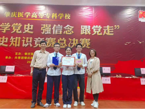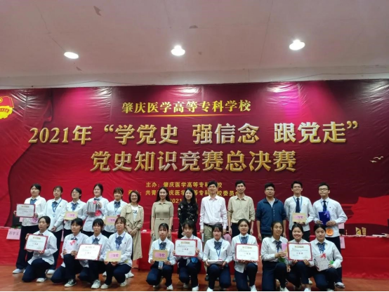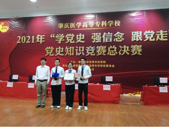 2021年4月30号晚上,“学党史 强信念 跟党走”党史知识竞赛总决赛在鼎湖区学术厅隆重举行。参加活动的有学校党委副书记陈彤,团委副书记张哲,口腔系党支部副书记王华山,药学系党支部副书记翟英杰,中医系团总支书记张紫恒,口腔系团总支书记欧晓燕,团干程晓及学生代表。口腔系何泳欣、吴志龙、曾思贤三位学生代表参赛,经过紧张激烈的角逐,最终斩获全校第一名。