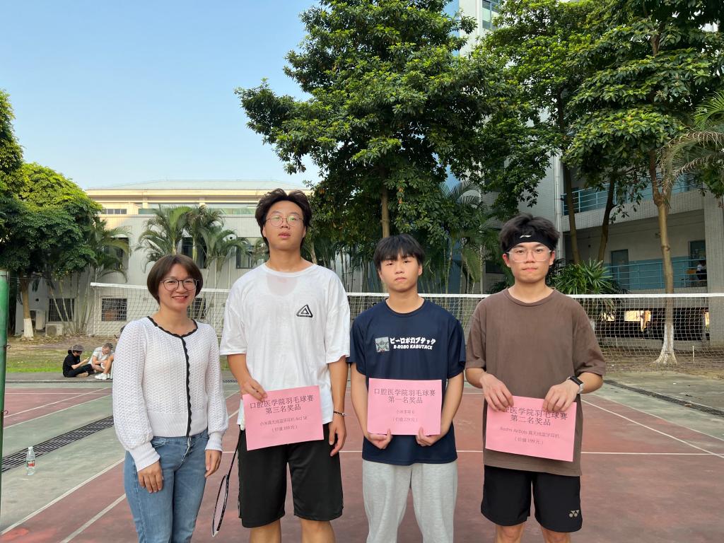 在羽毛球场,运动健儿们尽情地发挥,全程投入地对待每一次发球、接球,紧张而热烈的比赛不仅感染了在场的老师和同学们,更是吸引了附近宿舍楼上的同学们在宿舍阳台上认真观赛,一声声加油喝彩更是把比赛气氛拉到了最高点!经过激烈的比赛,最终决出了前三名获胜选手,他们分别是:第一名,口腔1班郑煜;第二名,口腔3班陈优;第三名,口腔4班尚新堃。
