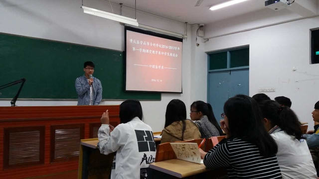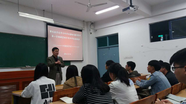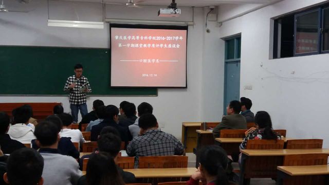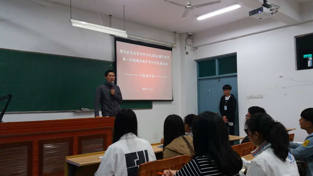 2016年12月14日晚,我校口腔医学系于鼎湖校区召开2016-2017学年第一学期教学质评学生座谈会。会议由口腔医学系黎祺老师主持,参会有各专任教师、辅导员以及20余名各班级学生代表。全系各班级代表踊跃上台发言,点评各科任老师的上课情况,肯定各老师教学的同时也提出各自的建议。各参会老师就相关问题一一记录并给出解答,师生互相讨论,场面热闹,座谈效果明显。