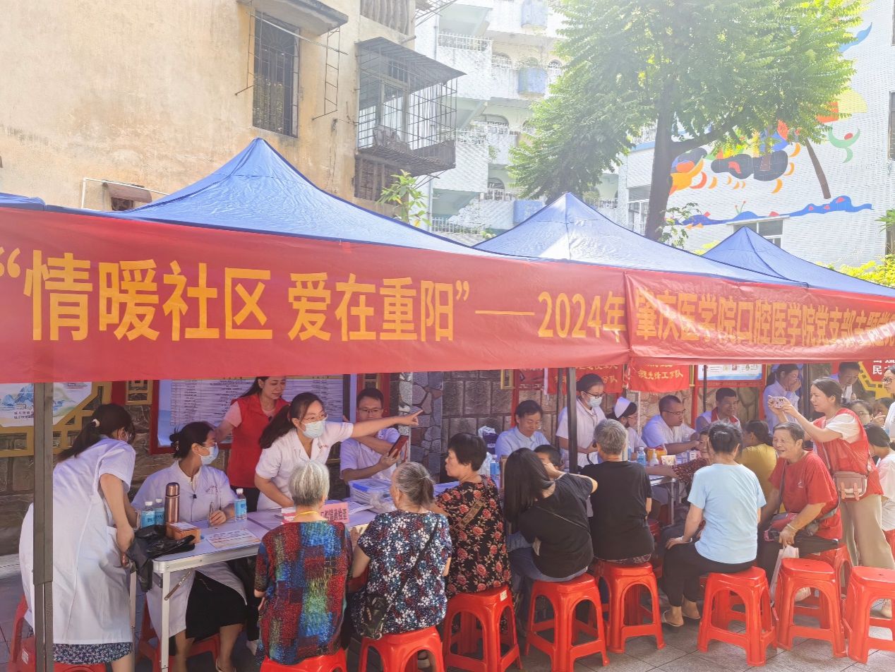 为深入开展端州区“百件暖民心党建实事”,积极营造敬老爱老社会氛围,引导全社会传承敬老爱老传统美德,为老年人送温暖、办实事、做好事、解难事,把健康送到居民家门口,2024年10月12日,必赢bwin线路检测中心党支部积极响应学校党委号召,与跃龙社区共建健康圩举办以“情暖社区、爱在重阳——健康圩志愿服务”主题党日活动,为社区老年人提供口腔健康检查与咨询服务。