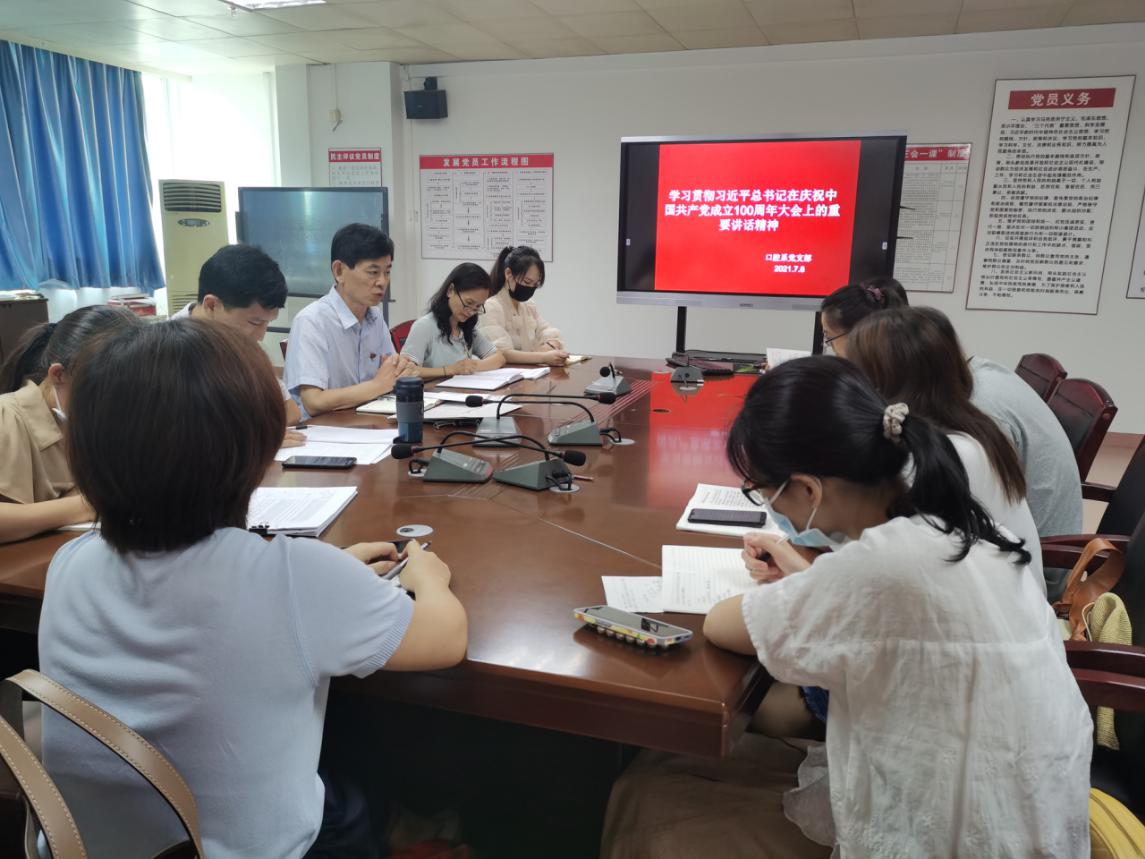 2021年7月8日上午,口腔党支部召开会议,传达学习习近平总书记在庆祝中国共产党成立100周年大会上的重要讲话精神,会议由支部书记刘燕主持,学校党委副书记陈彤作重要讲话,支部全体党员参加会议。