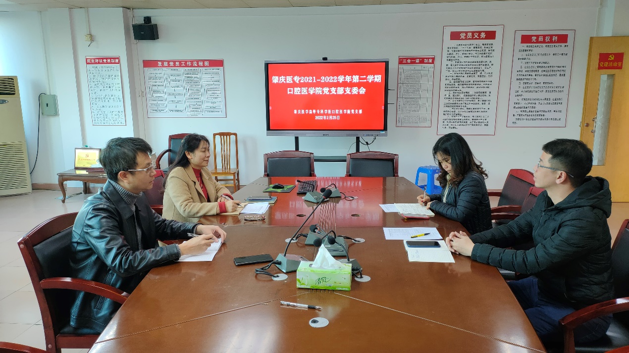 2022年2月25日下午,必赢bwin线路检测中心党支部支委在端州校区四楼会议室召开了本学期第一次支委会。会议由口腔学院党支部书记黎祺同志主持,会议开始黎祺书记带领大家学习第一议题《习近平总书记在中央经济工作会议上的重要讲话精神》,随后学习了学校党委下发的《中国共产党支部工作条例》、《组织建设工作指南》、《2022年党支部党建工作安排》等文件。会上,各支委针对必赢bwin线路检测中心本学期的主题党日活动内容、发展党员事宜、学院网页新闻报道要求、口腔专业文化节活动安排、学院劳动教育方案、学院人才引进计划等内容进行讨论并达成共识。
