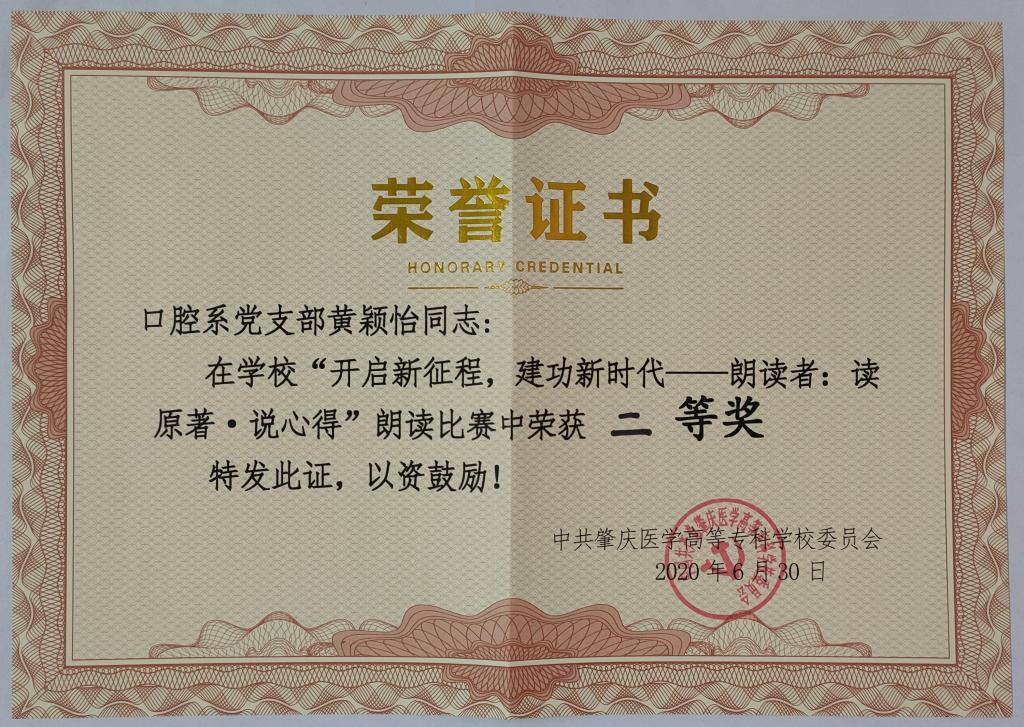 校级2020年“开启新征程,建功新时代-朗读者:读原著说心得”朗读比赛二等奖